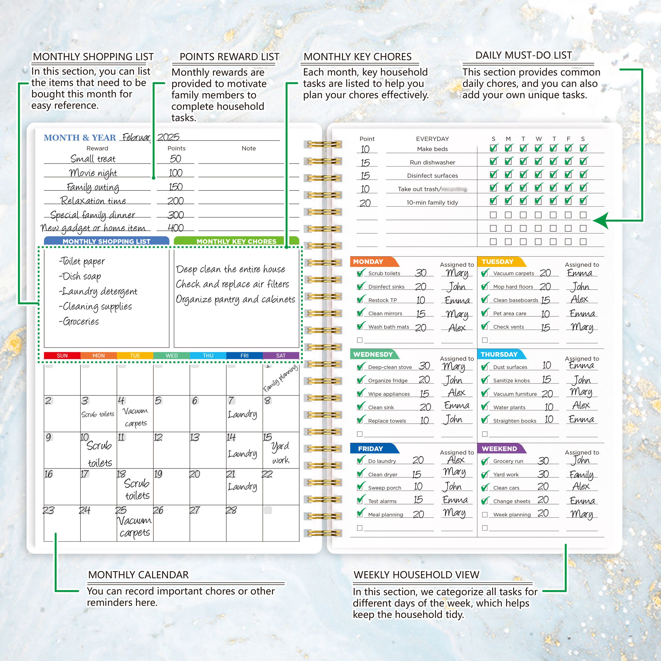 <p>Key features of this planner include:</p> <ul> <li><b>Monthly Shopping List</b>: Easily list items that need to be bought for quick reference.</li> <li><b>Points Reward System</b>: Motivate family members to complete household tasks with a fun points system.</li> <li><b>Monthly Key Chores</b>: Detailed lists of monthly key household tasks to help you plan your chores effectively.</li> <li><b>Daily Must-Do List</b>: Includes common daily chores and space for your unique tasks, ensuring nothing is missed.</li> <li><b>Monthly Calendar</b>: Record important chores or other reminders.</li> <li><b>Weekly Household View</b>: Breakdown tasks for different days of the week, helping you keep the household tidy.</li> </ul>