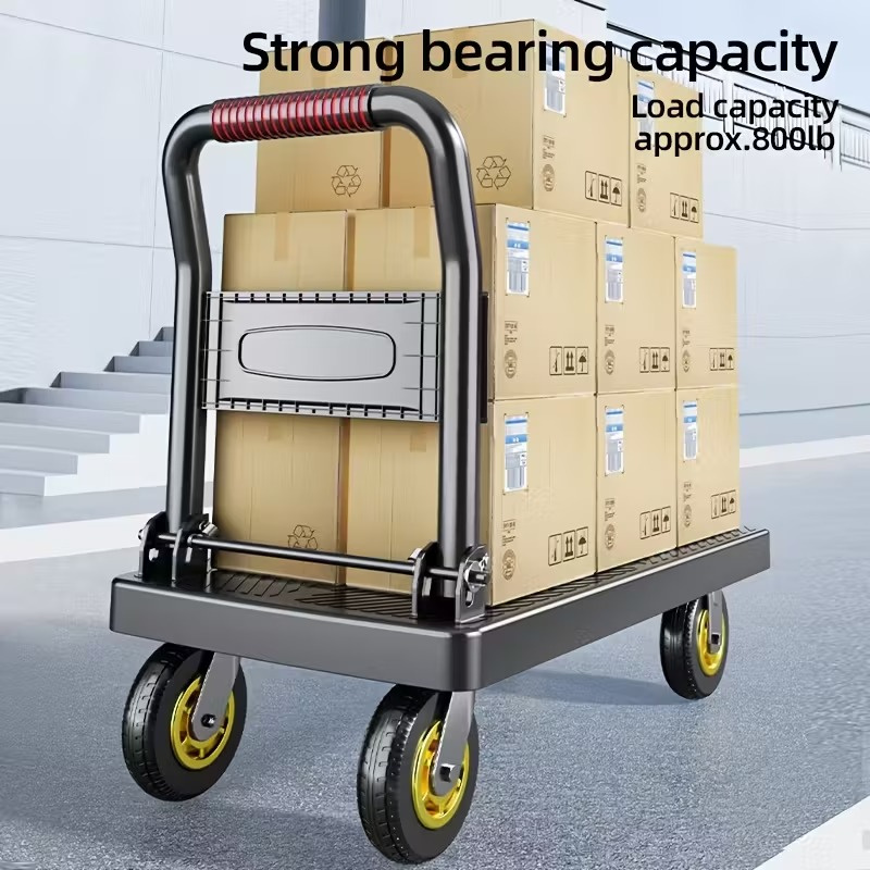 Crafted with a reinforced steel and metal frame, it offers reliable support and long-term durability. The textured anti-slip platform helps prevent cargo from sliding, while the ergonomically designed handle improves control and comfort. Thanks to the quiet, 360° swivel wheels, you’ll enjoy smooth and silent transportation even on rough surfaces — and with lockable front casters, your load stays securely in place when parked.