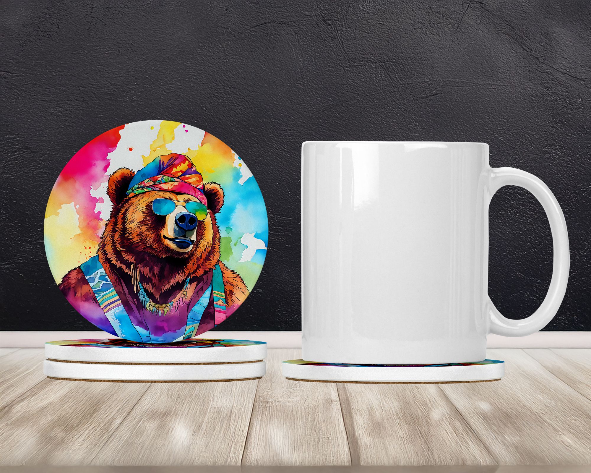 Hippie Animal Grizzly Bear Large Sandstone Coasters Pack of 4 Absorbent Round Coasters Decor Gifts for Men or Women, 4 in, Multicolor
