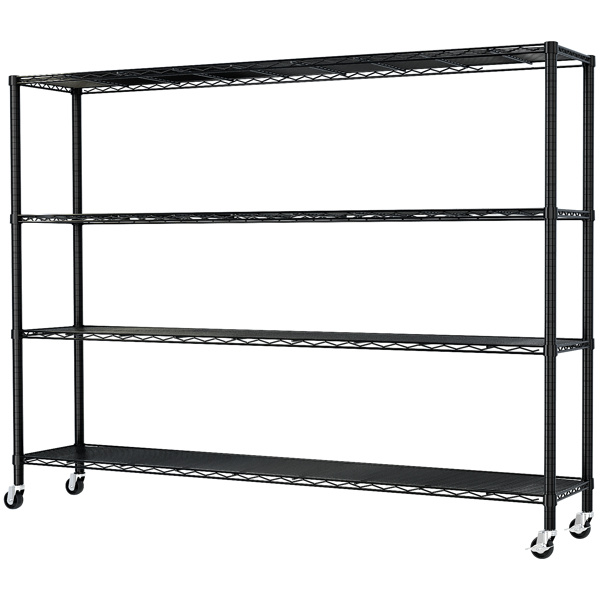 4-tier, adjustable shelf spacing, with adjustable feet and wheels, iron display stand, 150*60*192cm, powder-coated black 4-tier, adjustable shelf spacing, with adjustable feet and wheels, iron display stand, 150*60*192cm, powder-coated black