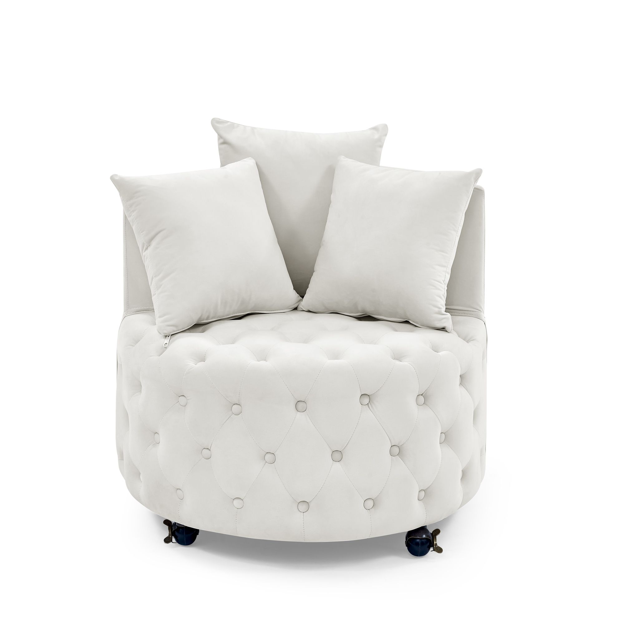 Home > Velvet Upholstered Swivel Chair for Living Room, with Button Tufted Design and Movable Wheels, Including 3 Pillows